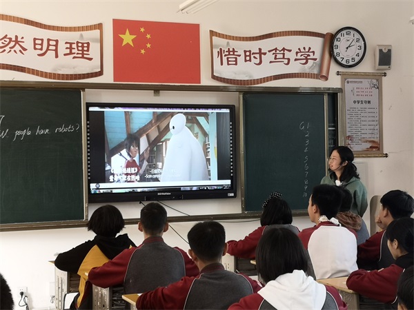 本堂课的主题是谈论未来的地球和人类生活,同时,引入了机器人这一话题。两位老师分别引用了两段关于机器人的视频,顺利引出了本堂课的话题,可谓异曲同工。周老师利用多组对比图让学生们顺利习得并掌握本堂课的目标语言,并在听力环节中充分开展小组合作,在核对完答案后让学生们小组合作完成听力部分的转述。很好地锻炼了学生语言组织和小组合作能力,学生参与度高,氛围好。孟老师在课堂实施与评价中,灵活引导学生,让不同层次的学生能够开口表达,达到了分层教学的目标。