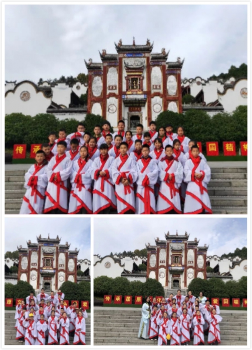 今天的第一堂研学课程是山门礼拜。同学们在屈原祠山门前穿楚服,行拜师礼仪。
