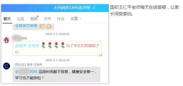 面对教育部发出的“各地原计划正式开学前不要提前开始新学期课程网上教学”的通知,天问老师们在自我隔离的同时,选择线上陪伴在学生身边,心理安抚、学习辅导、生活习惯养成、个人卫生和身体锻炼指导……事无巨细,每天坚持在班级群里关心慰问,了解每一位学生的现状,真正做到了隔离不隔爱。