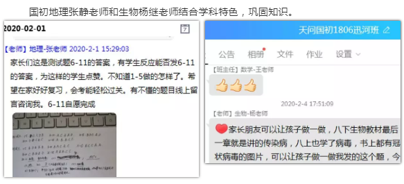 高新天问初中屈直老师通过家长群了解学生在家的生活和学习状态;对于亲子关系比较紧张的学生,做好心理疏导工作;帮助学生制定宅家学习与生活计划表,依计划打卡实施。自1月31日开始,他会在前一天布置限时作业,第二天中午通过群直播为两个班学生有针对性地义务辅导一小时。作业有追踪,辅导有内容,有问必答,有求必应,家长和学生十分感动!