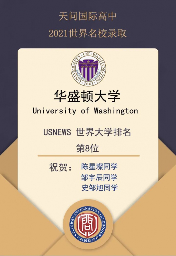 截至2021年,我校毕业生先后荣获美国公立常青藤华盛顿大学、佛罗里达大学、匹兹堡大学;英国伦敦大学学院、爱丁堡大学;加拿大多伦多大学、麦吉尔大学;澳大利亚墨尔本大学、悉尼大学;中国香港城市大学、香港理工大学等世界顶级名校录取通知书!