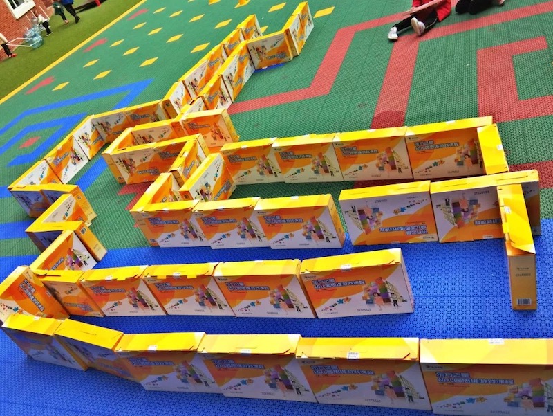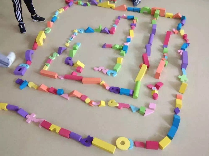 此时,孩子们泡沫积木也拼搭成了一个设计感十足的竞技赛道。