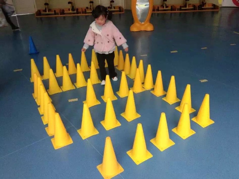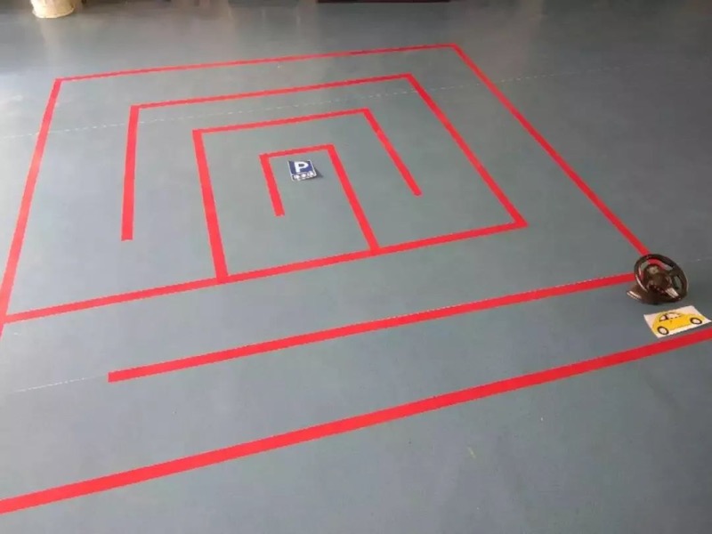 利用颜色鲜艳的即时贴在空地上贴出迷宫线路,投放汽车、方向盘和停车标志,让孩子通过观察、判断,用最快速的方法将小汽车停放在停车区域。