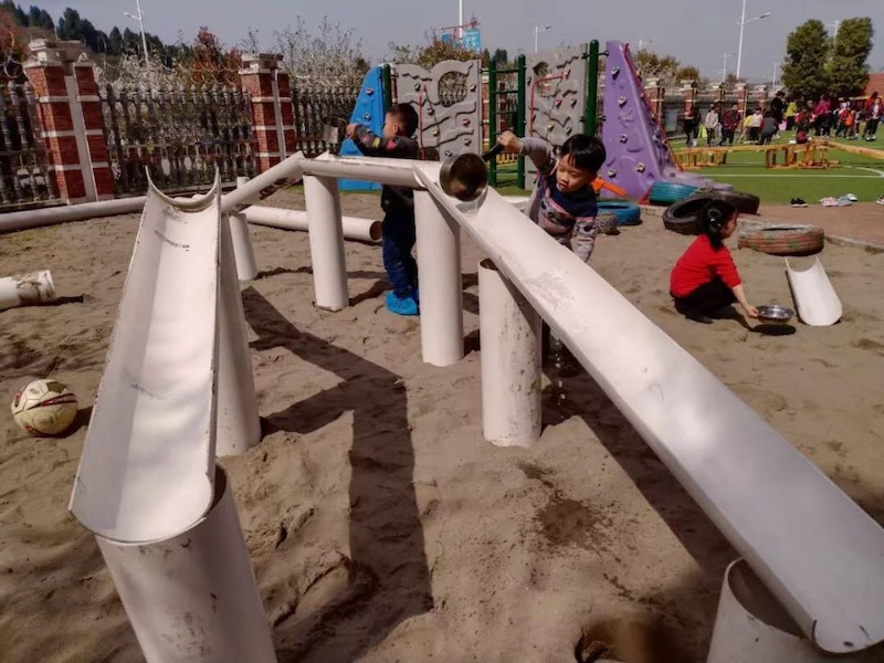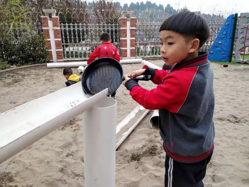 用水桶提沙太费劲了,怎么才能省时省力快速运沙了?小脑袋转一转,聪明的孩子们想到了用PVC管来运沙。