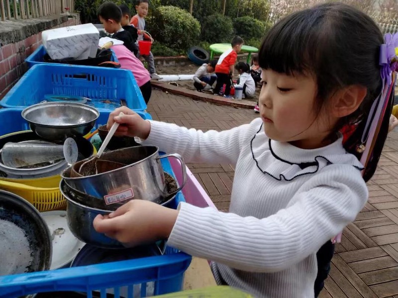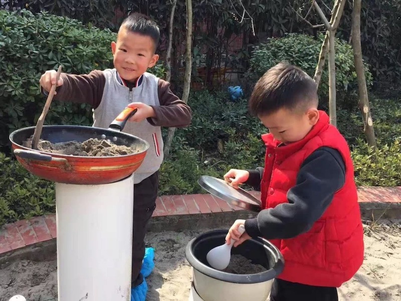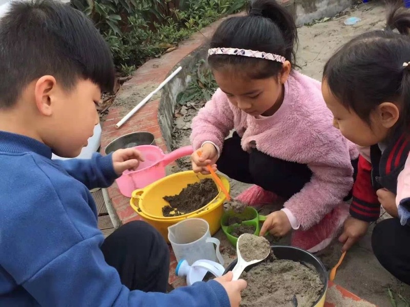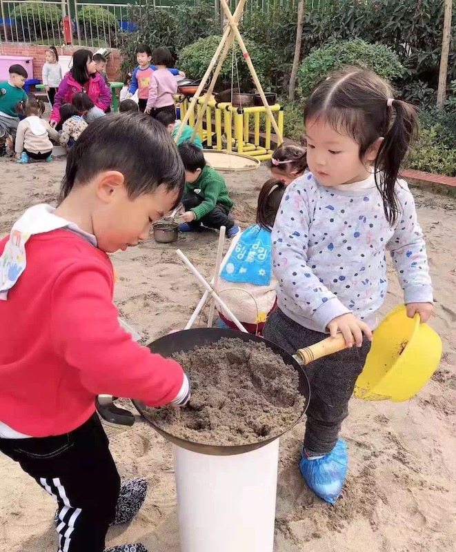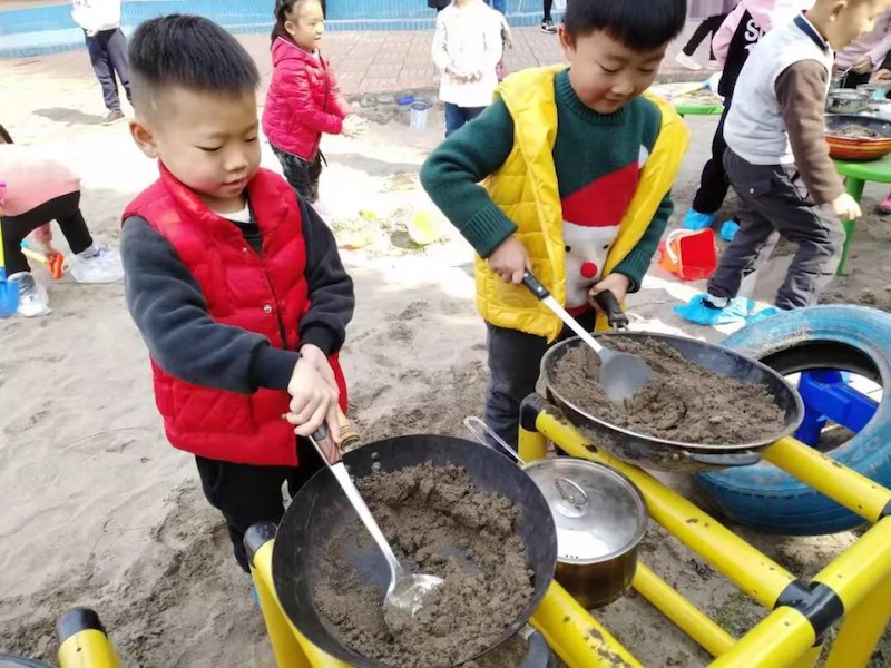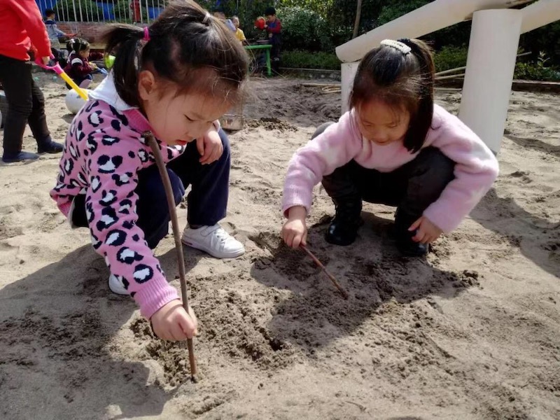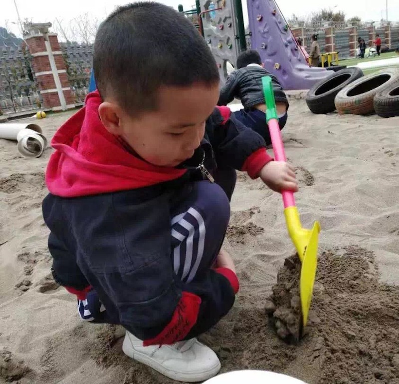生活中常见的物品来到了沙池就会大变身,被孩子们变成了挖沙的工具,小朋友就会开始了乐此不疲的“挖宝”行动,先挖个坑再把玩具用沙盖起来,然后再将玩具挖出来,循环往复。看似简单的重复环节与动作,孩子们却是乐此不疲。