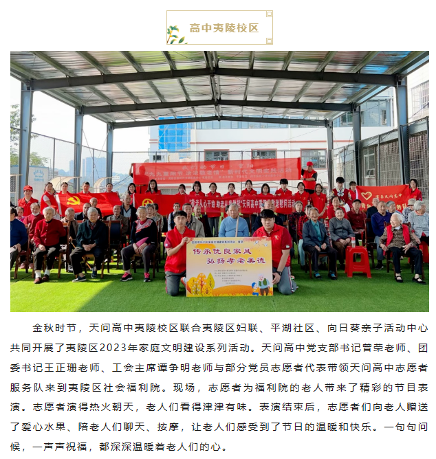 志愿花开,幸福重阳。连日来,在天问教育集团团委组织下,天问高中两校区开展了形式多样、内容丰富的庆“重阳”系列活动,弘扬中华民族尊老、敬老、爱老、助老的...