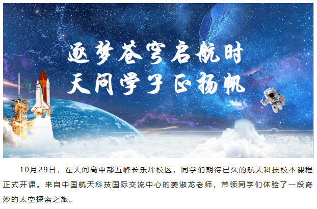 10月29日,在天问高中部五峰长乐坪校区,同学们期待已久的航天科技校本课程正式开课。来自中国航天科技国际交流中心的姜淑龙老师,带领同学们体验了一段奇妙...