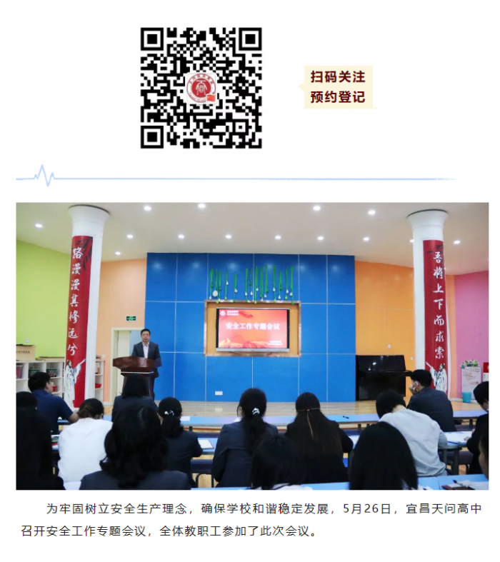 为牢固树立安全生产理念,确保学校和谐稳定发展,5月26日,宜昌天问高中召开安全工作专题会议,全体教职工参加了此次会议。...